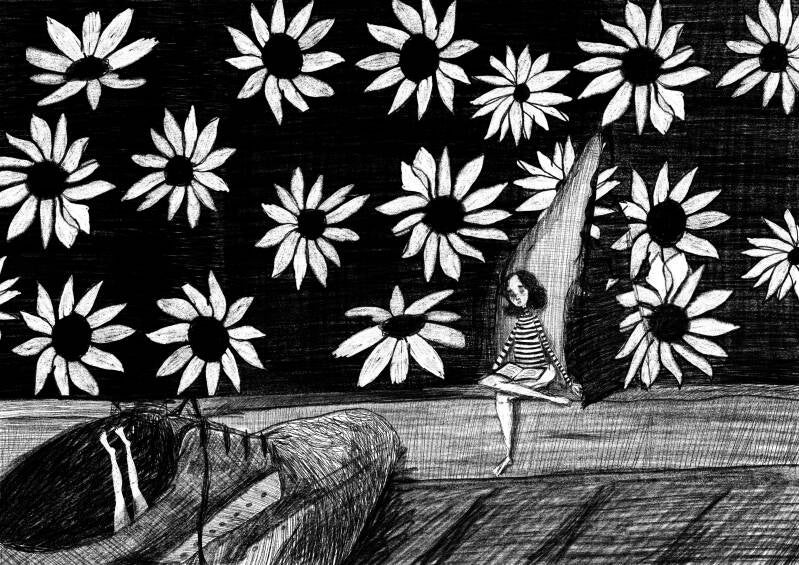 Geïllustreerd jeugdboek met korte verhalen. Alle tekeningen zijn gemaakt in donkerblauwe tinten.